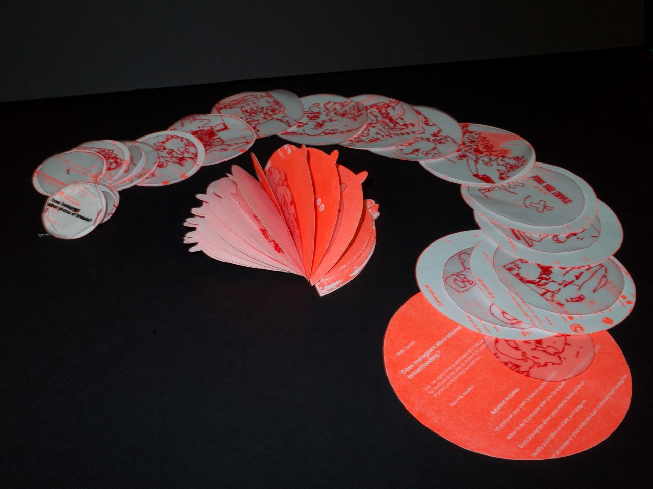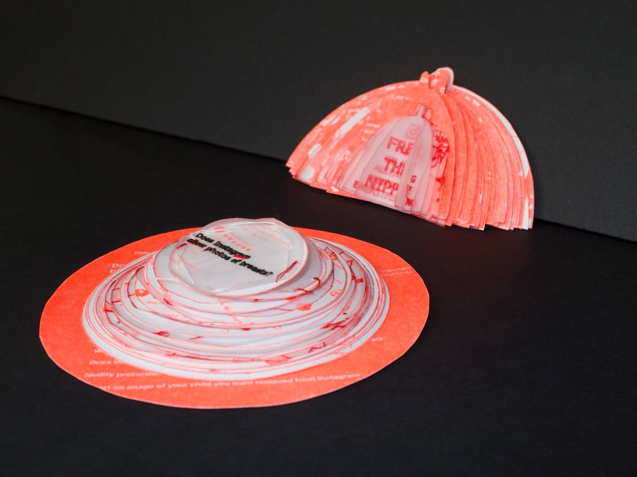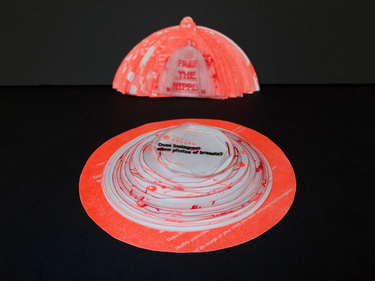 In this breast-shaped zine, I incorporated image-traced photos of the Free The Nipple movement and problematic comments under sexualized breastfeeding videos on Instagram. These two very different aspects of breasts both present the existing censorship and sexualization of the female body. Instagram posted a policy that allows photos of breasts only when it is in the context of breastfeeding. Even though with a good intention of demystifying breastfeeding, the reality is not that good. Frustrated by the disconnection between intention and result, I wonders the impact of each incident - one being people putting their bodies out there to protest, the other being posting breastfeeding videos (and getting sexualized comments). Using two different kinds of paper, I was also thinking about the difference between the intangible social media and physical bodies in real life, and which one of them is more fragile. It is absurd that sometimes the airy internet seems more concrete than the bodily action in real life.